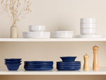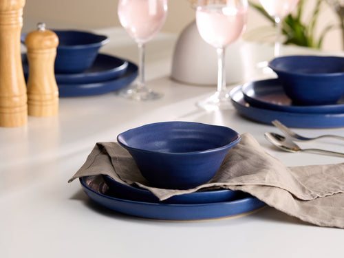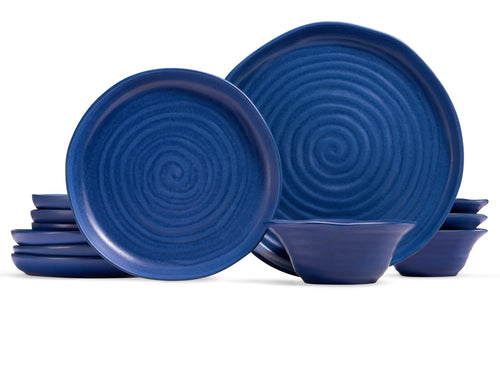 A blend of handcrafted charm and modern edge, this dinnerware set is designed to bring a warm air to any dinner table. Each dish is crafted with sturdy, matte stoneware, an organic asymmetric shape, rich navy color and embossed spiral texture. Perfect for serving breakfast cereals, saucy pastas, steak dinners and everything in between!