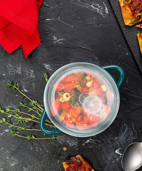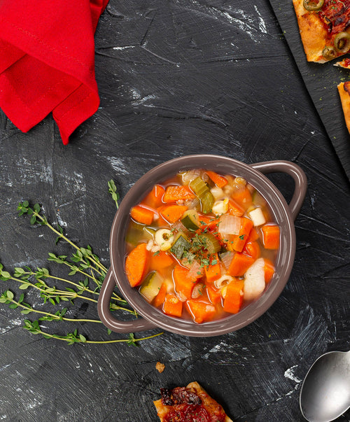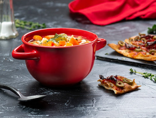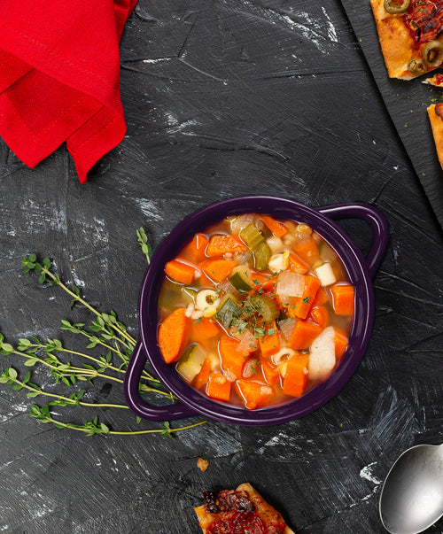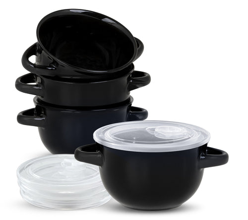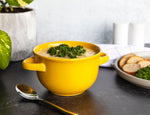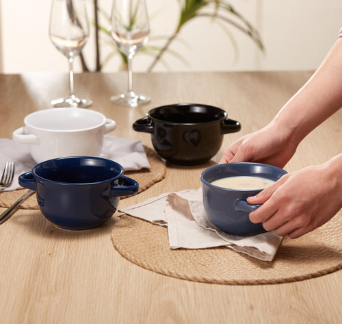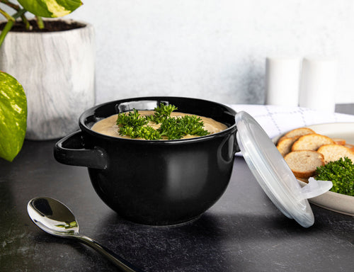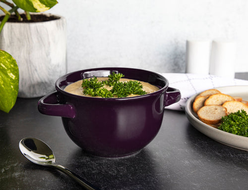 These charming, generously sized ceramic soup crocks are designed with stay-cool handles for breezy oven to table transfer. Perfect for everything from individual pot-pies and casseroles to our personal favorite; gooey, cheesy, crouton-y French Onion. Serve, stack, store and repeat!