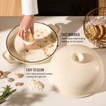Meet the Bread Oven of your dreams. This one-pot wonder can do everything, from grilling fish and saute' vegetables to baking loaves of crusty breads and pizzas. Made from thick and heavy cast iron that’ll never crack under high temperatures or heavy usage. This trusty pot distributes heat evenly, locks in moisture and flavor, and keeps food warm from the oven to the table. Use it in the oven, on the stove, or on an induction surface!