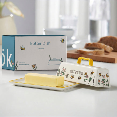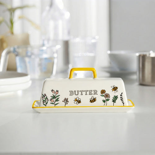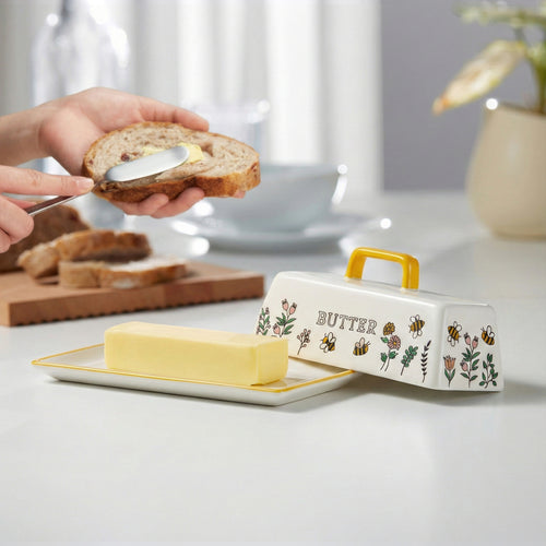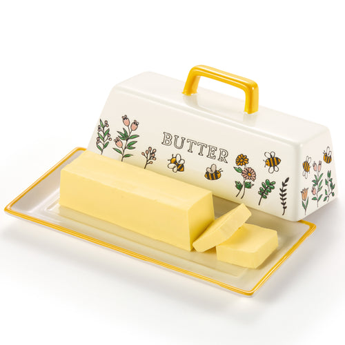 This isn't your grandma's butter dish. But it could be. It's classic, sturdy, and holds one standard stick of butter. The top handle makes it easy to lift the lid, and the squared design allows you to rest the lid on its side while you smother those biscuits in melty, golden goodness.