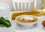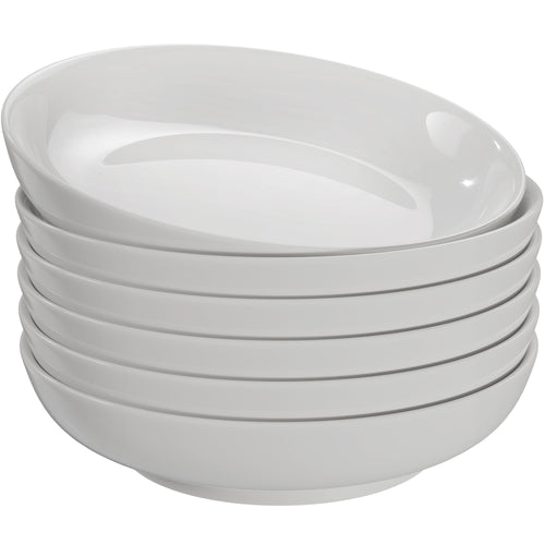 It's a bowl, it's a plate. it's both?! Wide and shallow, these versatile dishes are perfect for serving pasta, salads, desserts, and stews. Made with durable white ceramic with a glossy finish and extra large 32 ounce capacity. These bowls stack snugly for space-saving storage. Pop in the dishwasher for easy cleanup.