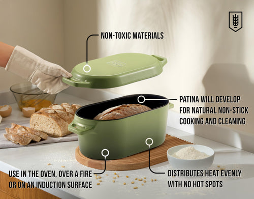 Meet the Dutch Oven of your dreams. This one-pot wonder can do it all from simmering soups to roasting fall-apart meats and baking loaves of crusty homemade sourdough. Made from thick and heavy cast iron that’ll never crack under high temperatures or heavy usage. This trusty pot distributes heat evenly, locks in moisture and flavor, and keeps food warm from the oven to the table. Use it in the oven, over a fire or on an induction surface!