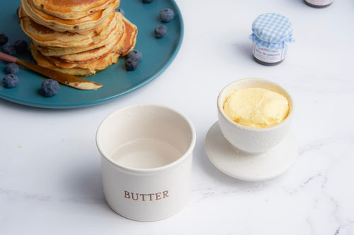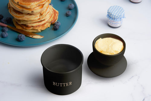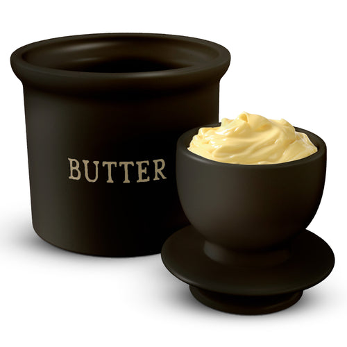 Goodbye, cold, hard, and crumbly butter. This little unassuming crock is the answer to all of your brittle butter misery. We're talking smooth, creamy, dreamy butter—all day every day. Part of our Farmhouse collection, this butter keeper is made with earthy speckled ceramic and engraved lettering. Sprinkle a little rustic personality on your countertop!