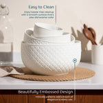 Salty breezes, rocky ridges, gothic architecture…(insert wistful sigh). Part of our Narbonne Bowl Collection, these Nesting Bowls are reminiscent of the coasts and cathedrals of this Mediterranean port city. Made from durable and glossy cream stoneware that’s safe for the microwave and dishwasher. Each bowl is embossed with a geometric pattern and finished with burnt dark copper accents. Can this one set be the answer to non-existent pantry space and overflowing dirty dishes? We think yes.