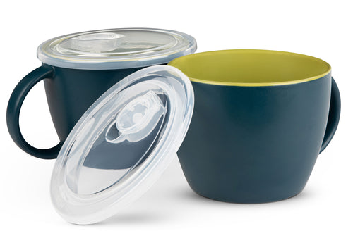 One bowl. Serve, Store, Reheat. And repeat! These ceramic Soup Mugs have a deep 25 oz interior and are perfect for casseroles, cereals, soups and more. Pack at home and microwave at the office. Leftovers? Pop on the lid and stick in the fridge or freezer.