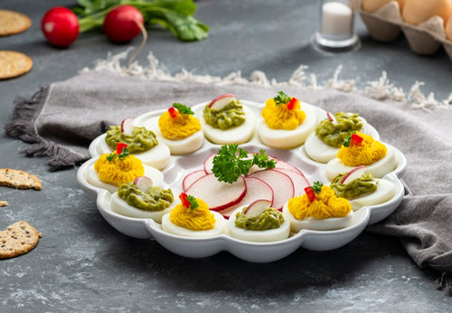 The perfect dish for serving munchies at barbeques, parties, tailgates and picnics. Fits up to 12 devilled eggs halves, with room in the center for veggies and other snacks!