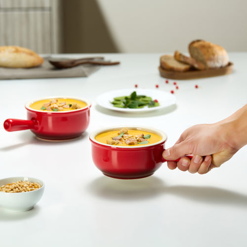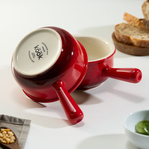 These durable ceramic crocks are designed with a large stay-cool handle for breezy oven-to-table transfer. Perfect for everything from individual pot-pies and casseroles to our personal favorite; gooey, cheesy French Onion.